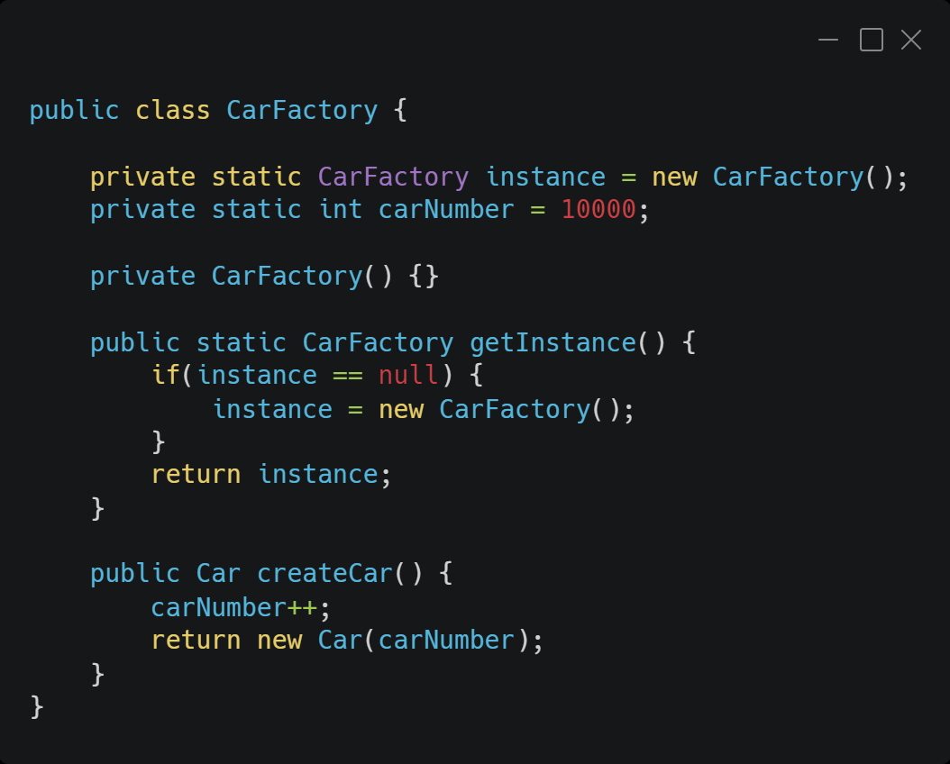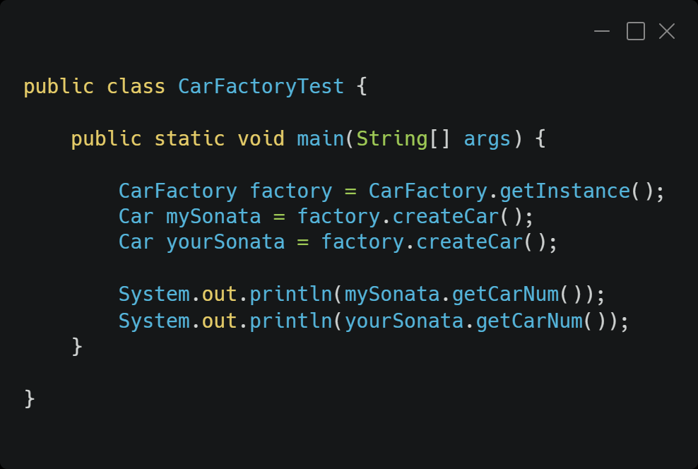 - 자동차 번호가 10001번부터 시작되어 자동차가 생산될 때마다 10002, 10003 이렇게 번호가 붙도록 자동차 공장 클래스, 자동차 클래스를 구현하세요.CarFactory.java