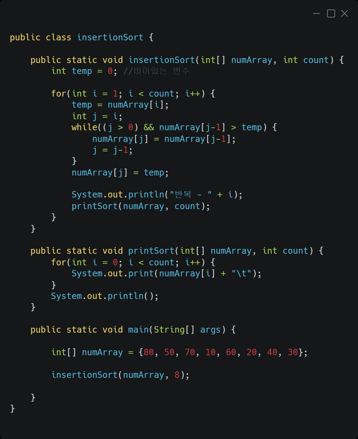 - 삽입 정렬: 이미 정렬된 상태의 요소에 새로운 요소를 추가할 때 정렬하여 추가하는 개념