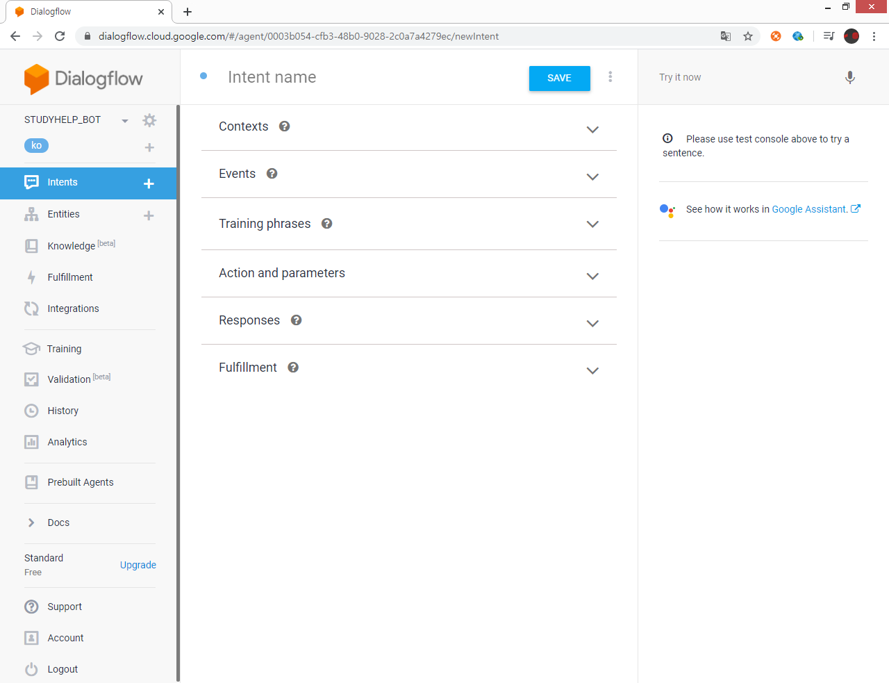 처음으로 제일 상단에 있는 빈 칸에 인텐트 이름을 작성해주세요.